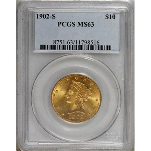 <B>1902-S $10 MS63 PCGS.</B></I> PCGS Population (663/352). NGC Census: (673/647). Mintage: 469,500. Numismedia Wsl. Price for NGC/PCGS coin in MS63: $835. (#8751)<BR><BR><B>Coin Engraver:</B> Christian Gobrecht<BR><BR><b>Shipping:</b> Coins & Currency (<a target="_blank" href="http://www.heritageauctions.com/common/shipping.php">view shipping information</a>\)