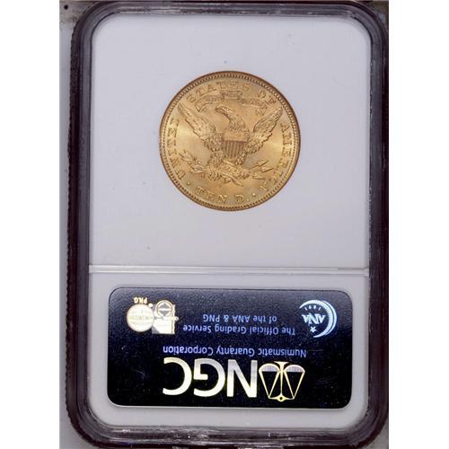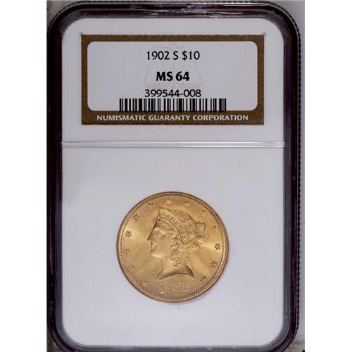 <B>1902-S<$10> MS64 NGC.</B></I> A thoroughly lustrous peach-gold beauty that features a precise strike and an especially clean reverse. An attractive example of this popular type coin.