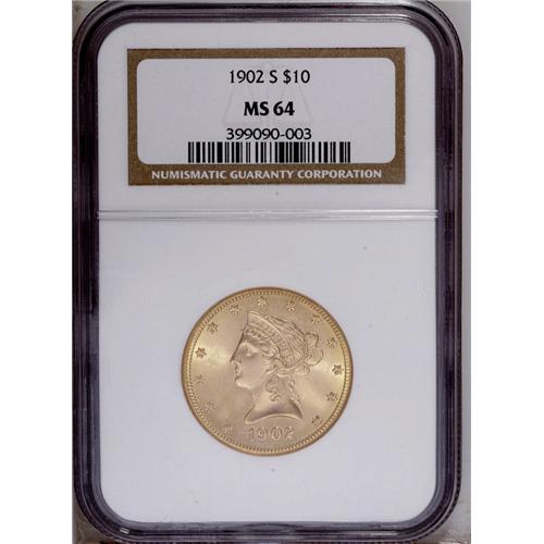 <B>1902-S $10 MS64 NGC.</B></I> Booming luster and an intricate strike combine with pleasing preservation for impressive eye appeal. The 1902-S is among the more plentiful issues in the series in better Mint State grades, but near-Gems are always in demand as a quality representative of the gold type.