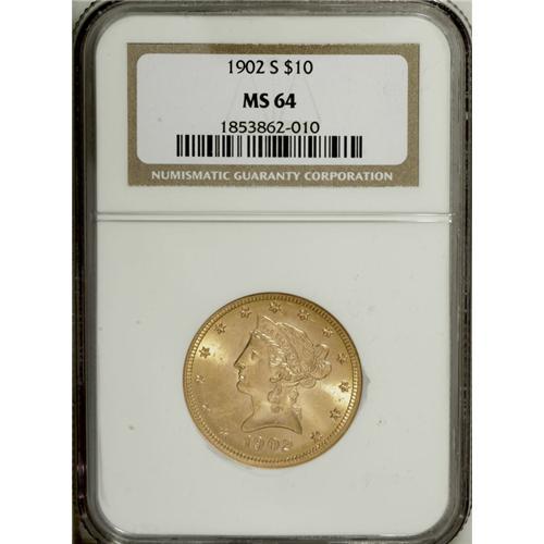 <B>1902-S $10 MS64 NGC.</B></I> Original olive and apricot colors grace this lustrous near-Gem, which has a pinpoint strike and a distinctly clean reverse. A few stray marks in the left obverse field prohibit a higher grade.<BR><BR><b>Shipping:</b> Coin/Currency (<a target="_blank" href="http://www.heritageauctions.com/common/shipping.php">view shipping information</a>)