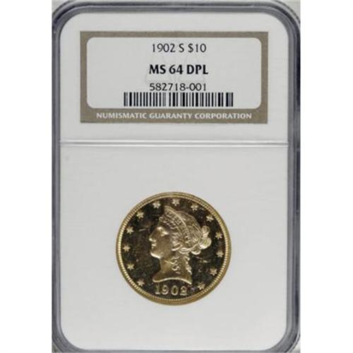 <B>1902-S $10 MS64 Deep Mirror Prooflike NGC.</B></I> Sharply struck design elements stand out against the deeply mirrored fields of this near-Gem S-mint ten dollar. Attractive yellow-gold color uniformly covers both faces, each of which reveals light grade-limiting scuffs. The 1902-S is one of the more available S-mint eagles, making it a popular type coin.<BR><I>From The New York Eye Appeal Collection, Part Three.</B></I><BR><BR><B>Coin Engraver:</B> Christian Gobrecht<BR><BR><b>Shipping:</b> Coins & Currency (<a target="_blank" href="http://www.heritageauctions.com/common/shipping.php">view shipping information</a>)