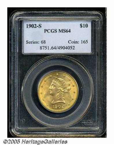 <B>1902-S<$10> MS64 PCGS.</B></I> Fully struck with sparkling, richly lustrous surfaces that reveal pleasing coloration and scattered small abrasions that define this otherwise attractive coin as a near-Gem.