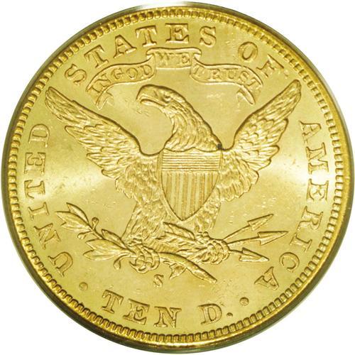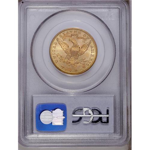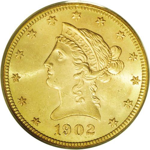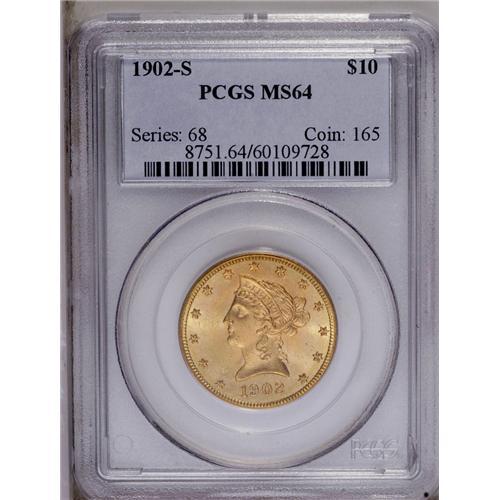 <B>1902-S<$10> MS64 PCGS.</B></I> Original olive and apricot colors grace this lustrous near-Gem, which has a pinpoint strike and a fairly clean reverse. A single black spot is noted above the right upper corner of the shield. Population: 287 in 64, 45 finer (2/06).