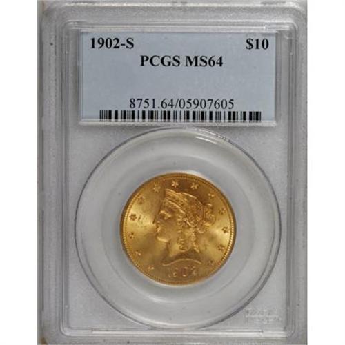 <B>1902-S $10 MS64 PCGS.</B></I> Strongly lustrous with a hint of satin on the butter-yellow surfaces. This S-mint near-Gem shows only a few pinpoint marks on the decisively struck portrait. PCGS has graded 53 finer pieces (9/07).<BR><BR><B>Coin Engraver:</B> Christian Gobrecht<BR><BR><b>Shipping:</b> Coins & Currency (<a target="_blank" href="http://www.heritageauctions.com/common/shipping.php">view shipping information</a>)