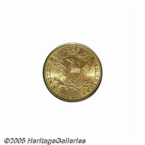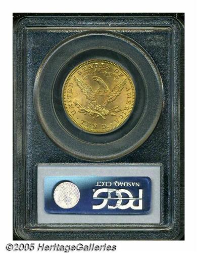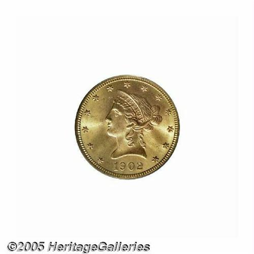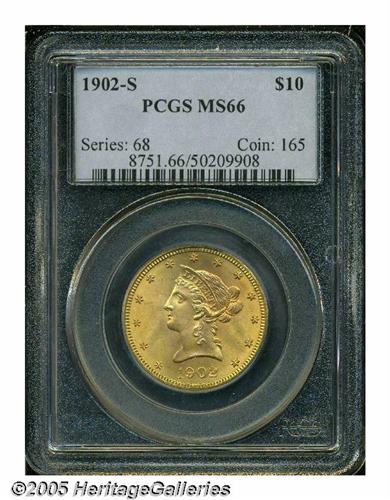 <B>1902-S<$10> MS66 PCGS.</B></I> A superior type coin and much scarcer in high grades than the 1901-S. The striking details are fully brought up on each side and there are no obvious or distracting abrasions. Most of each side has orange-gold coloration with an intermix of green-gold color in a variegated fashion. Population: 2 in 66, 1 finer (5/05).