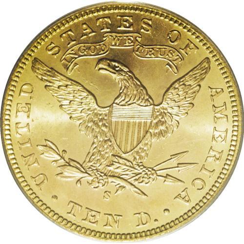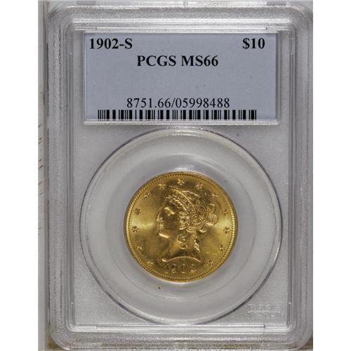 <B>1902-S $10 MS66 PCGS.</B></I> This clean-cheeked high grade Liberty eagle has apricot centers bounded by lime iridescence. The strike is impressive, with only a trace of softness on the lowest point of a couple of upper stars. Thorough evaluation of the lustrous fields locates only minor grazes. The 1902-S is commonplace in bagmarked Mint State grades, but becomes a significant rarity at the MS66 level. Population: 4 in 66, 1 finer (10/06).<BR><BR><b>Shipping:</b> Coin/Currency (<a target="_blank" href="http://www.heritageauctions.com/common/shipping.php">view shipping information</a>)
