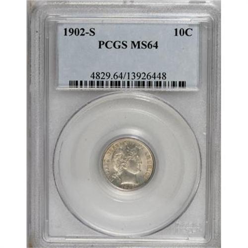 <B>1902-S 10C MS64 PCGS.</B></I> An uncommonly well-preserved example of this mid-date Barber dime issue, strongly lustrous with a touch of gold-green patina at the centers. Solidly struck overall with only a handful of faint abrasions. Population: 15 in 64, 17 finer (8/07).<BR><BR><B>Coin Engraver:</B> Charles E. Barber<BR><BR><b>Shipping:</b> Coins & Currency (<a target="_blank" href="http://www.heritageauctions.com/common/shipping.php">view shipping information</a>)