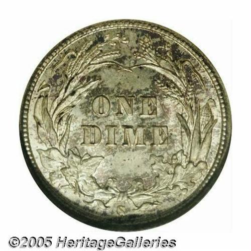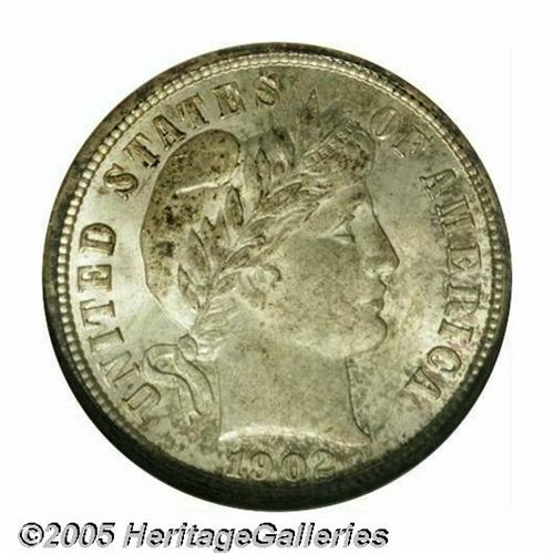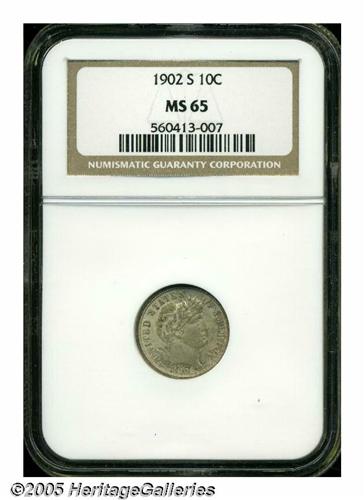 <B>1902-S<10C> MS65 NGC.</B></I> A moderately toned, well struck example of this scarcer year. In fact, the depth of the toning obscures some of the luster, and aside from a couple of tiny reverse contact marks, this is the only grade-limiting factor. Population: 8 in 65, 5 finer (4/05).