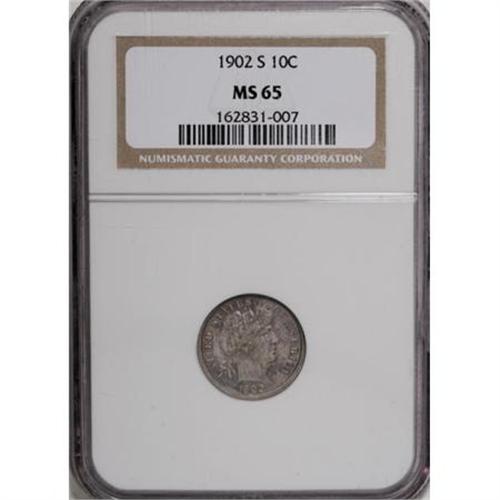 <B>1902-S 10C MS65 NGC.</B></I> Deep toning in shades of pinkish-gold and aqua covers the surfaces on both sides. There are no evident signs of contact. Writing in 1999, David and John Feigenbaum called the 1902-S a "sleeper," and nearly 10 years later the NGC Gem population stands at only 12 pieces, with three finer (1/08).<BR><I>From The Southwest Collection.</B></I><BR><BR><B>Coin Engraver:</B> Charles E. Barber<BR><BR><b>Shipping:</b> Coins & Currency (<a target="_blank" href="http://www.heritageauctions.com/common/shipping.php">view shipping information</a>)