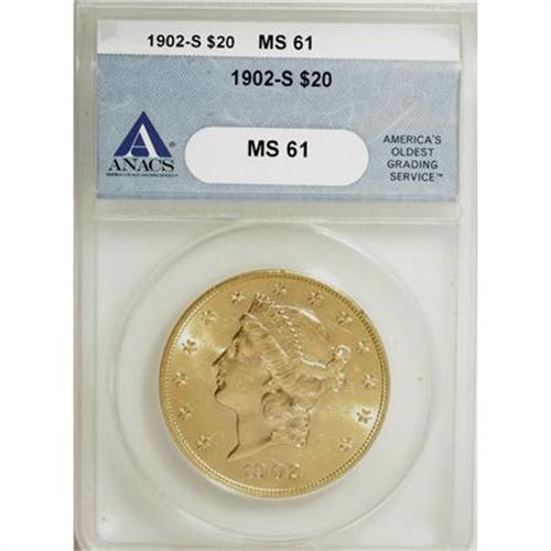 <B>1902-S $20 MS61 ANACS.</B></I> NGC Census: (1315/1382). PCGS Population (752/1618). Mintage: 1,753,625. Numismedia Wsl. Price for NGC/PCGS coin in MS61: $900. (#9042)<BR><BR><B>Coin Engraver:</B> James B. Longacre<BR><BR><b>Shipping:</b> Coins & Currency (<a target="_blank" href="http://www.heritageauctions.com/common/shipping.php">view shipping information</a>)
