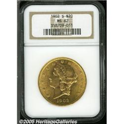 <B>1902-S $20 MS62 NGC.</B></I> Bright peach-gold patina embraces each side of this well struck S-mint. A few minute marks are evident, particularly on the obverse.
