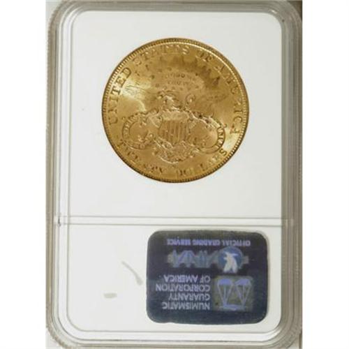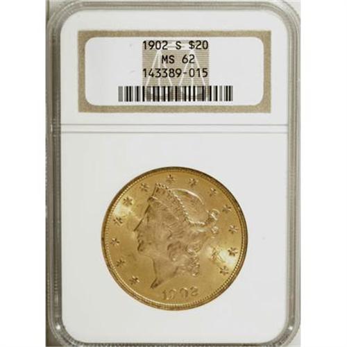 <B>1902-S $20 MS62 NGC.</B></I> NGC Census: (1104/278). PCGS Population (1106/512). Mintage: 1,753,625. Numismedia Wsl. Price for NGC/PCGS coin in MS62: $935. (#9042)<BR><BR><B>Coin Engraver:</B> James B. Longacre<BR><BR><b>Shipping:</b> Coins & Currency (<a target="_blank" href="http://www.heritageauctions.com/common/shipping.php">view shipping information</a>)