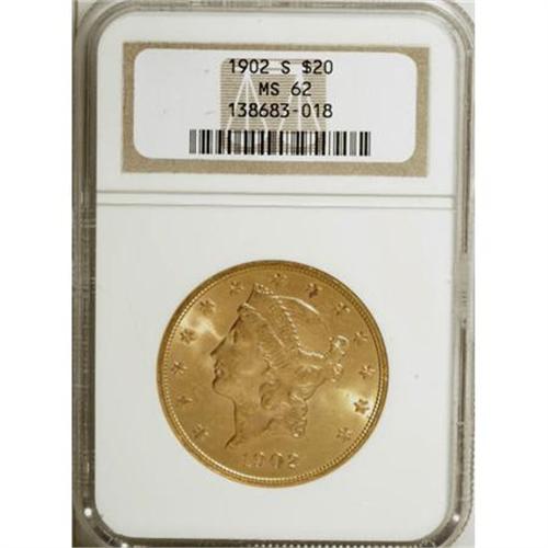 <B>1902-S $20 MS62 NGC.</B></I> NGC Census: (1104/278). PCGS Population (1106/512). Mintage: 1,753,625. Numismedia Wsl. Price for NGC/PCGS coin in MS62: $935. (#9042)<BR><BR><B>Coin Engraver:</B> James B. Longacre<BR><BR><b>Shipping:</b> Coins & Currency (<a target="_blank" href="http://www.heritageauctions.com/common/shipping.php">view shipping information</a>)