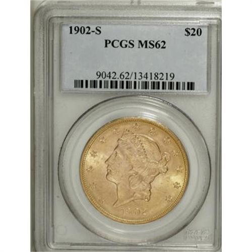 <B>1902-S $20 MS62 PCGS.</B></I> Highly lustrous with a flashy cartwheel sheen and well struck design elements. Bright honey-rose coloration adorns both sides. Moderately bagmarked, as usual for the grade. <BR><BR><B>Coin Engraver:</B> James B. Longacre<BR><BR><b>Shipping:</b> Coins & Currency (<a target="_blank" href="http://www.heritageauctions.com/common/shipping.php">view shipping information</a>)