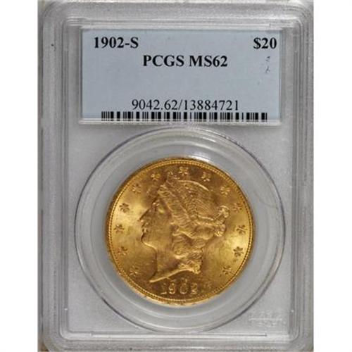 <B>1902-S $20 MS62 PCGS.</B></I> PCGS Population (1081/501). NGC Census: (1086/272). Mintage: 1,753,625. Numismedia Wsl. Price for NGC/PCGS coin in MS62: $775. (#9042)<BR><BR><B>Coin Engraver:</B> James B. Longacre<BR><BR><b>Shipping:</b> Coins & Currency (<a target="_blank" href="http://www.heritageauctions.com/common/shipping.php">view shipping information</a>)