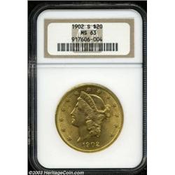 <table><tr><td><TABLE cellSpacing=0 cellPadding=0 width="100%" bgColor=#000000 border=0><TBODY> <TR><TD width="100%"><TABLE cellSpacing=1 cellPadding=3 width="100%" border=0><TBODY><TR><TD width="100%" bgColor=#79735c><FONT face=arial color=#ffffff size=3><B>Description</B> </FONT></TD></TR><TR><TD width="100%" bgColor=#ffffff><FONT face=arial size=2><B>1902-S $20 MS63 NGC.</B></I> Clearly superior to the vast majority of heavily abraded Uncirculated pieces, this dazzling reddish-golden example has only a few well scattered blemishes and benefits from the high production standards employed by the San Francisco Mint during this period. One of the nicest '02-S Twenties we have recently offered. </FONT></TD></TR></TBODY></TABLE></TD></TR></TBODY></TABLE><BR><A name=PricesRealized></A><TABLE cellSpacing=0 cellPadding=0 width="100%" bgColor=#000000 border=0><TBODY><TR><TD width="100%"><TABLE cellSpacing=1 cellPadding=3 width="100%" border=0><TBODY><TR><TD width="100%" bgColor=#79735c><A name=PR><FONT face=arial color=#ffffff size=3><B>Previous Prices from Heritage Auctions</B> </FONT></A></TD></TR><TR><TD bgColor=#f6f6ed><TABLE cellSpacing=0 cellPadding=0 width="100%" border=1><TBODY><TR><TD align=middle width="33%"><B>Date</B></TD><TD align=middle width="33%"><B>Service</B></TD><TD align=middle width="33%"><B>Price</B></TD></TR><TR bgColor=whitesmoke><TD width="33%"><B>06/10/2003</B></TD><TD width="33%">PCGS</TD><TD width="33%">$2,702.50</TD></TR><TR bgColor=whitesmoke><TD width="33%"><B>09/24/2002</B></TD><TD width="33%">NGC</TD><TD width="33%">$1,955.00</TD></TR><TR bgColor=whitesmoke><TD width="33%"><B>10/30/2001</B></TD><TD width="33%">NGC</TD><TD width="33%">$1,200.00</TD></TR><TR bgColor=whitesmoke><TD width="33%"><B>11/25/2002</B></TD><TD width="33%">PCGS</TD><TD width="33%">$2,185.00</TD></TR><TR bgColor=whitesmoke><TD width="33%"><B>06/08/2002</B></TD><TD width="33%">PCGS</TD><TD width="33%">$1,782.50</TD></TR><TR bgColor=whitesmoke><TD width="33%"><B>01/12/2002</B></TD><TD width="33%">NGC</TD><TD width="33%">$1,725.00</TD></TR><TR bgColor=whitesmoke><TD width="33%"><B>04/26/1996</B></TD><TD width="33%">NGC</TD><TD width="33%">$1,072.50</TD></TR><TR bgColor=whitesmoke><TD width="33%"><B>07/01/1993</B></TD><TD width="33%">NGC</TD><TD width="33%">$1,540.00</TD></TR></TBODY></TABLE></TD></TR><TR><TD bgColor=#ffffff><FONT face=arial size=1 ?>PLEASE NOTE: All prices realized reflect the final hammer price PLUS the buyer's premium in auctions that charge a buyer's premium. Each item has a notation at the top of the listing indicating whether that lot included a buyer's premium. Example: A item that sells with a final hammer price of $100 and a 20% buyer's premium will display with a price realized of $120. All information listed is intended to be as accurate as possible, but errors are possible. Please use this guide carefully and inform us of any inaccuracies. </FONT></TD></TR></TBODY></TABLE></TD></TR></TBODY></TABLE><BR><TABLE cellSpacing=0 cellPadding=0 width="100%" bgColor=#000000 border=0><TBODY><TR><TD width="100%"><TABLE cellSpacing=1 cellPadding=3 width="100%" border=0><TBODY><TR><TD width="100%" bgColor=#79735c colSpan=6><FONT face=arial color=#ffffff size=3><B>Price Guide*</B> </FONT></TD></TR><TR bgColor=#f6f6ed><TD align=middle><B>Grade</B> </TD><TD align=middle><B>Coin World<BR>(Trends)</B> </TD><TD align=middle><B>Numismedia<BR>Retail</B> </TD><TD align=middle><B>Numismedia<BR>Wholesale</B> </TD><TD align=middle><B>Coin<BR>Universe</B> </TD><TD align=middle><B>Heritage<BR>Value Index</B> </TD></TR><TR bgColor=#ffffff><TD align=middle>62</TD><TD align=right>$600.00</TD><TD align=right>$630.00</TD><TD align=right>$525.00</TD><TD align=right>$825.00</TD><TD align=right>$824.13</TD></TR><TR style="FONT-WEIGHT: bold" bgColor=#cccfdd><TD align=middle>63</TD><TD align=right>$2,625.00</TD><TD align=right>---</TD><TD align=right>$2,025.00</TD><TD align=right>$3,250.00</TD><TD align=right>$2,333.13</TD></TR><TR bgColor=#ffffff><TD align=middle>64</TD><TD align=right>$8,000.00</TD><TD align=right>---</TD><TD align=right>$6,750.00</TD><TD align=right>$9,000.00</TD><TD align=right>$6,396.67</TD></TR><TR bgColor=#ffffff><TD colSpan=6><FONT size=1>*All information listed is intended to be as accurate as possible, but errors are possible. No item may be returned or refused based on this information which is provided as a service to our customers. You should contact each pricing source directly to determine the accuracy of this information. </FONT></TD></TR></TBODY></TABLE></TD></TR></TBODY></TABLE><BR><TABLE cellSpacing=0 cellPadding=0 width="100%" bgColor=#000000 border=0><TBODY><TR><TD width="100%"><TABLE cellSpacing=1 cellPadding=3 width="100%" border=0><TBODY><TR><TD width="100%" bgColor=#79735c><FONT face=arial color=#ffffff size=3><B>Population Guide</B> </FONT></TD></TR><TR bgColor=#ffffff><TD align=middle><!-- Begin Output of Population Grid--><TABLE cellSpacing=0 cellPadding=0 width="100%" border=0><TBODY><TR><TD vAlign=center><TABLE cellSpacing=0 width="100%" border=1 cellsadding="3"><TBODY><TR><TD vAlign=center><TABLE cellSpacing=0 cellPadding=3 width="100%" border=1><TBODY><TR><TD vAlign=center align=middle bgColor=#f0f1e8 colSpan=2 <CENTER><FONT face=Arial size=2><B>PCGS Pop </B></FONT><CENTER></CENTER></TD><TD vAlign=center align=middle bgColor=#f0f1e8 colSpan=2><CENTER><FONT face=Arial size=2><B>NGC Pop</B></CENTER></FONT></TD></TR><TR><TD vAlign=center><FONT face=Arial size=2>(63)</FONT> </TD><TD vAlign=center align=right><FONT face=Arial size=2>264</FONT> </TD><TD vAlign=center><FONT face=Arial size=2>(63)</FONT> </TD><TD vAlign=center align=right><FONT face=Arial size=2>176</FONT> </TD></TR><TR><TD vAlign=center><FONT face=Arial size=2>(>63)</FONT> </TD><TD vAlign=center align=right><FONT face=Arial size=2>36</FONT> </TD><TD vAlign=center><FONT face=Arial size=2>(>63)</FONT> </TD><TD vAlign=center align=right><FONT face=Arial size=2>25</FONT> </TD></TR></TBODY></TABLE></T