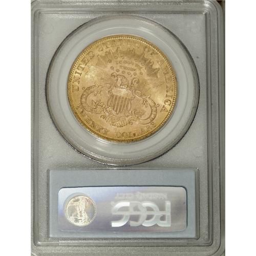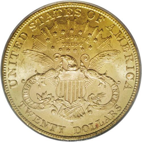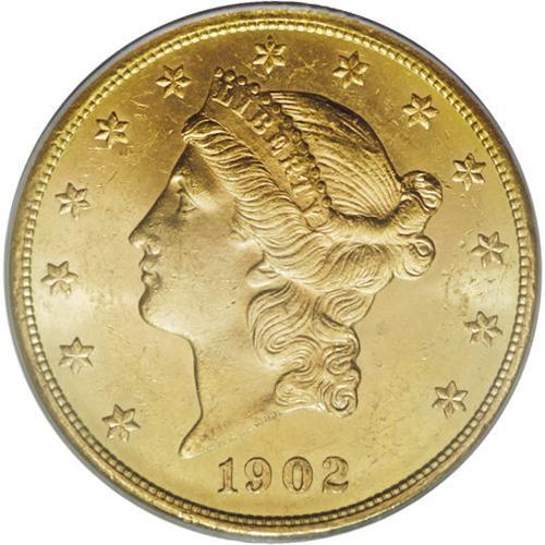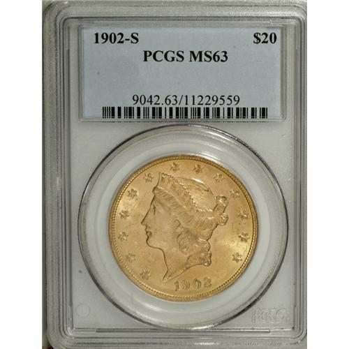 <B>1902-S $20 MS63 PCGS.</B></I> A wonderful example of this condition rarity with lustrous light yellow surfaces that are framed by a trace of olive near the borders. The design elements are sharply defined, and each side has scattered marks that are consistent with the grade. Just 41 finer examples of this issue have been graded by PCGS (4/07).<BR><BR><b>Shipping:</b> Coins & Currency (<a target="_blank" href="http://www.heritageauctions.com/common/shipping.php">view shipping information</a>)