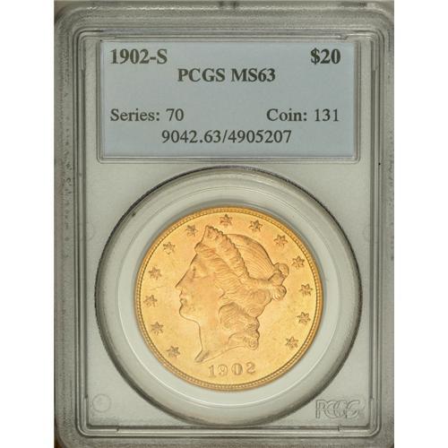 1902-S $20 MS63 PCGS. Essentially well struck, althoug