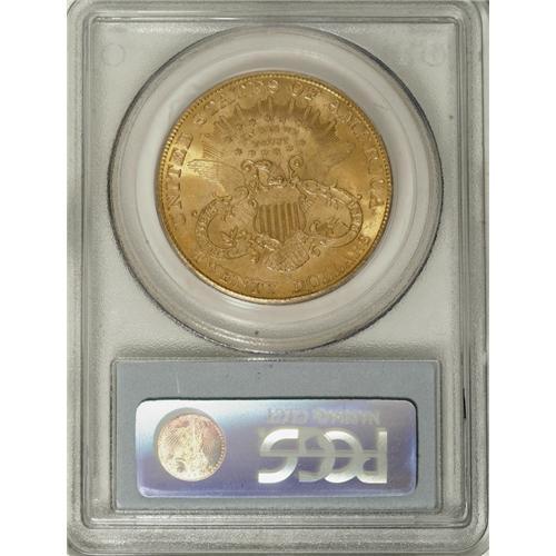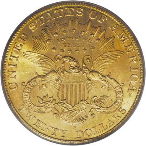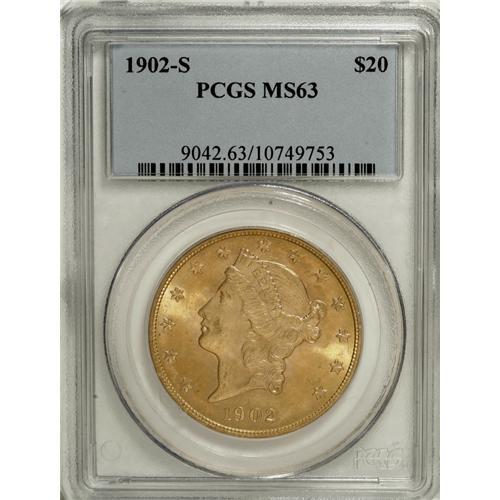 <B>1902-S $20 MS63 PCGS.</B></I> Here is another issue that is considered a condition rarity in finer grades. Although the MS63 population amounts to several hundred pieces, PCGS has only certified 41 examples in finer quality (4/07). A few trivial abrasions scattered across each side account for the limited grade. The strike is sharp and the orange-gold luster is exceptional.<BR><BR><b>Shipping:</b> Coins & Currency (<a target="_blank" href="http://www.heritageauctions.com/common/shipping.php">view shipping information</a>)