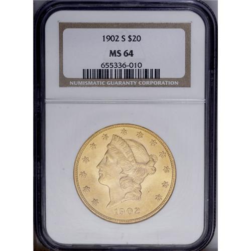 <B>1902-S $20 MS64 NGC.</B></I> The '02-S double eagle is not a rare date, and it is from a relatively high mintage in excess of 1 million coins. Examples in MS64 grade are among the finest known. In fact, NGC has only certified three finer examples of this issue. This one has rich orange-gold coloration with lovely surfaces. A few small marks are noted on Liberty's cheek. Census: 25 in 64, 3 finer (1/06).