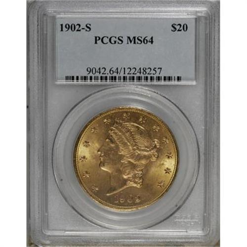<B>1902-S $20 MS64 PCGS.</B></I> A wonderful light yellow example of this condition rarity with sharp design elements, and a few faint surface marks that keep it from the Gem category. Considering that just three finer pieces have been certified by NGC, and those few tiny abrasions will save the bidder substantially. Census: 32 in 64, 3 finer (2/08).<BR><BR><B>Coin Engraver:</B> James B. Longacre<BR><BR><b>Shipping:</b> Coins & Currency (<a target="_blank" href="http://www.heritageauctions.com/common/shipping.php">view shipping information</a>)