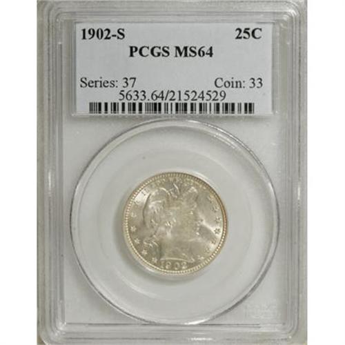 <B>1902-S 25C MS64 PCGS.</B></I> A scarcer S-mint issue that boasts a limited mintage of slightly more than 1.5 million pieces and is every bit as difficult in Mint State as its rather brief production would indicate. This Choice example displays excellent strike and luster characteristics. Smooth save for an inconspicuous reverse mark near 3 o'clock. Population: 18 in 64, 12 finer (1/08).<BR><I>Ex: Central States Signature (Heritage, 5/04), lot 7016.</B></I><BR><I>From The Southwest Collection.</B></I><BR><BR><B>Coin Engraver:</B> Charles E. Barber<BR><BR><b>Shipping:</b> Coins & Currency (<a target="_blank" href="http://www.heritageauctions.com/common/shipping.php">view shipping information</a>)
