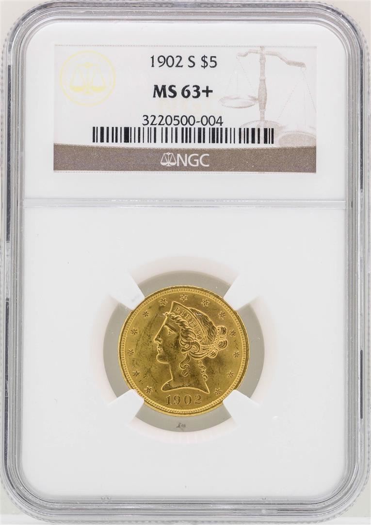 One 1902-S $5 Liberty Head Half Eagle Gold Coin NGC MS63+. NGC Certified.