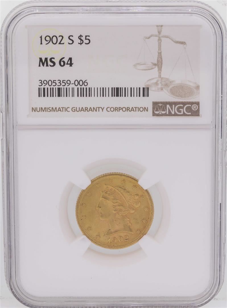 One 1902-S $5 Liberty Head Half Eagle Gold Coin NGC MS64. NGC Certified.