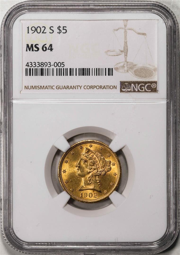 One 1902-S $5 Liberty Head Half Eagle Gold Coin NGC MS64. NGC Certified.