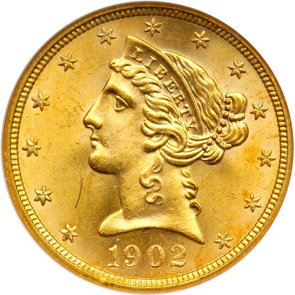 1902-S $5 Liberty. NGC graded MS-65. Light golden toning, a gem which would grade a point higher but for a faint hairline in the left obverse field. The luster on 1902-S is like that seen on 1901-S, bright, gleaming, everything that will thrill an audience of bidders in the room (PCGS # 8406) .