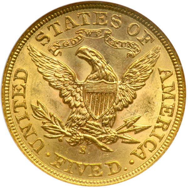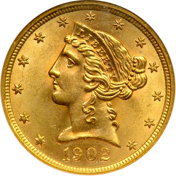 1902-S $5 Liberty. NGC graded MS-65. Rich golden toning. Strong metal flow augments the already showy mint luster that covers the surfaces of this Gem, giving the coin a brand new, glowing appearance. The mint brilliance is only broken up by a rare overlay of beautiful pale patina (PCGS # 8406) .