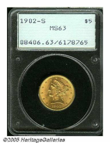 <B>1902-S<$5> MS63 PCGS.</B></I> A lustrous and sharply struck Liberty Five. The sunrise-gold surfaces possess charming eye appeal. Housed in a first generation holder.