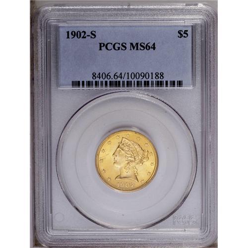 <B>1902-S<$5> MS64 PCGS.</B></I> A bright green-gold example with cartwheel luster in the fields and a small number of wispy field marks on the reverse that prevent a higher grade assessment. One of the more frequently encountered and best produced issues in the series.
