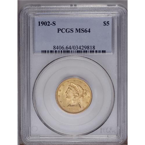 1902-S $5 MS64 PCGS. Bright, shimmering luster and sha