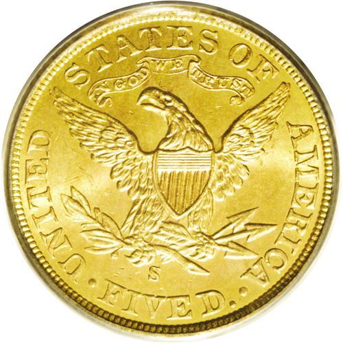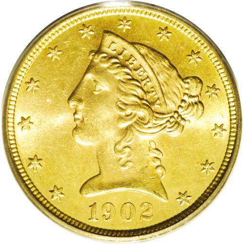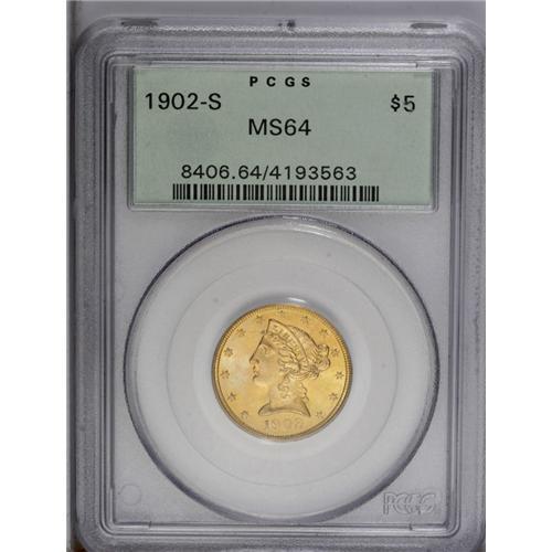 <B>1902-S<$5> MS64 PCGS.</B></I> Most of the surfaces are honey-gold, but the left obverse field has a patch of lilac and the reverse has areas of deep orange-red. A sharply struck example with great luster and a few small marks that keep this piece from Gem status. Housed in a green label holder.