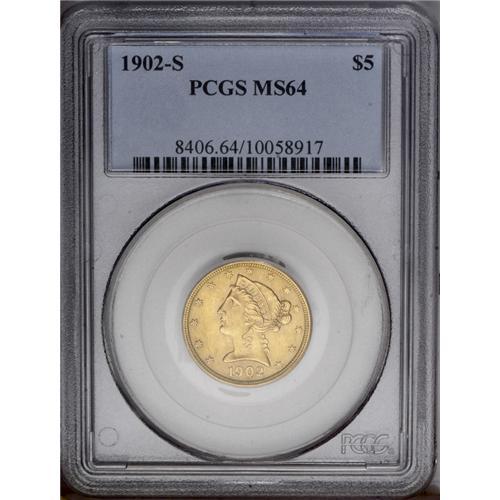 <B>1902-S<$5> MS64 PCGS.</B></I> Nicely struck with minor weakness noted on most of the obverse stars, lovely rich toning, and full satin luster that shimmers over both sides. Only tiny, superficial marks and faint luster grazes are evident under close examination of the bright surfaces.