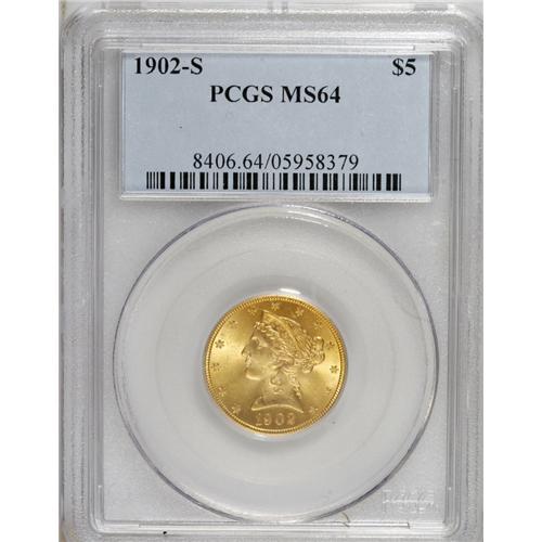 <B>1902-S $5 MS64 PCGS.</B></I> This lustrous and boldly struck near-Gem features radiant yellow-gold and lime toning. Pleasantly smooth, and deserving of a high quality gold type set.<BR><BR><b>Shipping:</b> Coins & Currency (<a target="_blank" href="http://www.heritageauctions.com/common/shipping.php">view shipping information</a>)