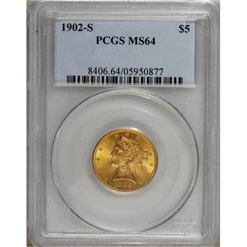 <B>1902-S $5 MS64 PCGS.</B></I> Rich peach patina endows this highly lustrous and exactingly struck near-Gem. Marks are minimal, and the eye appeal is obvious. An attractive example that lacks the significant and often distracting abrasions found on most other representatives.<BR><BR><B>Coin Engraver:</B> Christian Gobrecht<BR><BR><b>Shipping:</b> Coins & Currency (<a target="_blank" href="http://www.heritageauctions.com/common/shipping.php">view shipping information</a>\)