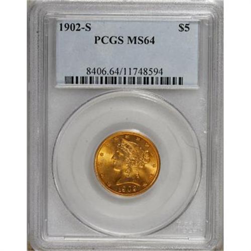<B>1902-S $5 MS64 PCGS.</B></I> PCGS Population (352/102). NGC Census: (398/184). Mintage: 939,000. Numismedia Wsl. Price for NGC/PCGS coin in MS64: $1,380. (#8406)<BR><BR><B>Coin Engraver:</B> Christian Gobrecht<BR><BR><b>Shipping:</b> Coins & Currency (<a target="_blank" href="http://www.heritageauctions.com/common/shipping.php">view shipping information</a>)