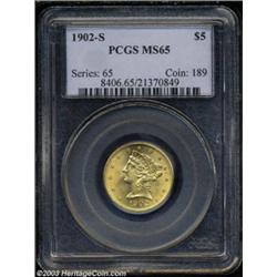 <table><tr><td><TABLE cellSpacing=0 cellPadding=0 width="100%" bgColor=#000000 border=0><TBODY> <TR><TD width="100%"><TABLE cellSpacing=1 cellPadding=3 width="100%" border=0><TBODY><TR><TD width="100%" bgColor=#79735c><FONT face=arial color=#ffffff size=3><B>Description</B> </FONT></TD></TR><TR><TD width="100%" bgColor=#ffffff><FONT face=arial size=2><B>1902-S $5 MS65 PCGS.</B></I> A typically well produced example with bright, shimmering luster and pinpoint sharpness (save for a few of the obverse stars). A brilliant golden appearance shows overall. One tiny milling mark is noted on Liberty's cheek. Population: 50 in 65, 17 finer (10/03). </FONT></TD></TR></TBODY></TABLE></TD></TR></TBODY></TABLE><BR><A name=PricesRealized></A><TABLE cellSpacing=0 cellPadding=0 width="100%" bgColor=#000000 border=0><TBODY><TR><TD width="100%"><TABLE cellSpacing=1 cellPadding=3 width="100%" border=0><TBODY><TR><TD width="100%" bgColor=#79735c><A name=PR><FONT face=arial color=#ffffff size=3><B>Previous Prices from Heritage Auctions</B> </FONT></A></TD></TR><TR><TD bgColor=#f6f6ed><TABLE cellSpacing=0 cellPadding=0 width="100%" border=1><TBODY><TR><TD align=middle width="33%"><B>Date</B></TD><TD align=middle width="33%"><B>Service</B></TD><TD align=middle width="33%"><B>Price</B></TD></TR><TR bgColor=whitesmoke><TD width="33%"><B>02/11/2003</B></TD><TD width="33%">NGC</TD><TD width="33%">$2,242.50</TD></TR><TR bgColor=whitesmoke><TD width="33%"><B>01/12/2002</B></TD><TD width="33%">PCGS</TD><TD width="33%">$3,450.00</TD></TR><TR bgColor=whitesmoke><TD width="33%"><B>10/01/1993</B></TD><TD width="33%">NGC</TD><TD width="33%">$4,620.00</TD></TR><TR bgColor=whitesmoke><TD width="33%"><B>05/01/1990</B></TD><TD width="33%">PCGS</TD><TD width="33%">$12,100.00</TD></TR><TR bgColor=whitesmoke><TD width="33%"><B>03/01/2000</B></TD><TD width="33%">NGC</TD><TD width="33%">$3,565.00</TD></TR></TBODY></TABLE></TD></TR><TR><TD bgColor=#ffffff><FONT face=arial size=1 ?>PLEASE NOTE: All prices realized reflect the final hammer price PLUS the buyer's premium in auctions that charge a buyer's premium. Each item has a notation at the top of the listing indicating whether that lot included a buyer's premium. Example: A item that sells with a final hammer price of $100 and a 20% buyer's premium will display with a price realized of $120. All information listed is intended to be as accurate as possible, but errors are possible. Please use this guide carefully and inform us of any inaccuracies. </FONT></TD></TR></TBODY></TABLE></TD></TR></TBODY></TABLE><BR><TABLE cellSpacing=0 cellPadding=0 width="100%" bgColor=#000000 border=0><TBODY><TR><TD width="100%"><TABLE cellSpacing=1 cellPadding=3 width="100%" border=0><TBODY><TR><TD width="100%" bgColor=#79735c colSpan=6><FONT face=arial color=#ffffff size=3><B>Price Guide*</B> </FONT></TD></TR><TR bgColor=#f6f6ed><TD align=middle><B>Grade</B> </TD><TD align=middle><B>Coin World<BR>(Trends)</B> </TD><TD align=middle><B>Numismedia<BR>Retail</B> </TD><TD align=middle><B>Numismedia<BR>Wholesale</B> </TD><TD align=middle><B>Coin<BR>Universe</B> </TD><TD align=middle><B>Heritage<BR>Value Index</B> </TD></TR><TR bgColor=#ffffff><TD align=middle>64</TD><TD align=right>$1,000.00</TD><TD align=right>---</TD><TD align=right>$1,200.00</TD><TD align=right>$1,000.00</TD><TD align=right>$747.13</TD></TR><TR style="FONT-WEIGHT: bold" bgColor=#cccfdd><TD align=middle>65</TD><TD align=right>---</TD><TD align=right>---</TD><TD align=right>$2,275.00</TD><TD align=right>$3,350.00</TD><TD align=right>$2,128.33</TD></TR><TR bgColor=#ffffff><TD align=middle>66</TD><TD align=right>---</TD><TD align=right>---</TD><TD align=right>$4,125.00</TD><TD align=right>$7,000.00</TD><TD align=right>$5,699.17</TD></TR><TR bgColor=#ffffff><TD colSpan=6><FONT size=1>*All information listed is intended to be as accurate as possible, but errors are possible. No item may be returned or refused based on this information which is provided as a service to our customers. You should contact each pricing source directly to determine the accuracy of this information. </FONT></TD></TR></TBODY></TABLE></TD></TR></TBODY></TABLE><BR><TABLE cellSpacing=0 cellPadding=0 width="100%" bgColor=#000000 border=0><TBODY><TR><TD width="100%"><TABLE cellSpacing=1 cellPadding=3 width="100%" border=0><TBODY><TR><TD width="100%" bgColor=#79735c><FONT face=arial color=#ffffff size=3><B>Population Guide</B> </FONT></TD></TR><TR bgColor=#ffffff><TD align=middle><!-- Begin Output of Population Grid--><TABLE cellSpacing=0 cellPadding=0 width="100%" border=0><TBODY><TR><TD vAlign=center><TABLE cellSpacing=0 width="100%" border=1 cellsadding="3"><TBODY><TR><TD vAlign=center><TABLE cellSpacing=0 cellPadding=3 width="100%" border=1><TBODY><TR><TD vAlign=center align=middle bgColor=#f0f1e8 colSpan=2 <CENTER><FONT face=Arial size=2><B>PCGS Pop </B></FONT><CENTER></CENTER></TD><TD vAlign=center align=middle bgColor=#f0f1e8 colSpan=2><CENTER><FONT face=Arial size=2><B>NGC Pop</B></CENTER></FONT></TD></TR><TR><TD vAlign=center><FONT face=Arial size=2>(65)</FONT> </TD><TD vAlign=center align=right><FONT face=Arial size=2>50</FONT> </TD><TD vAlign=center><FONT face=Arial size=2>(65)</FONT> </TD><TD vAlign=center align=right><FONT face=Arial size=2>80</FONT> </TD></TR><TR><TD vAlign=center><FONT face=Arial size=2>(>65)</FONT> </TD><TD vAlign=center align=right><FONT face=Arial size=2>17</FONT> </TD><TD vAlign=center><FONT face=Arial size=2>(>65)</FONT> </TD><TD vAlign=center align=right><FONT face=Arial size=2>25</FONT> </TD></TR></TBODY></TABLE></TD></TR></TBODY></TABLE></TD></TR></TBODY></TABLE><!-- End Output of Population Grid--></TD></TR></TBODY></TABLE></TD></TR></TBODY></TABLE><BR><TABLE cellSpacing=0 cellPadding=0 width="100%" bgColor=#000000 border=0><TBODY><TR> Important notice: Heritage usually auctions material at the rate of 200-250 lots per hour. On some occasions eBay Live bid software or the Internet may not be able to keep up with the pace of the auc