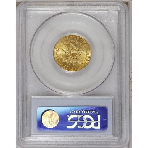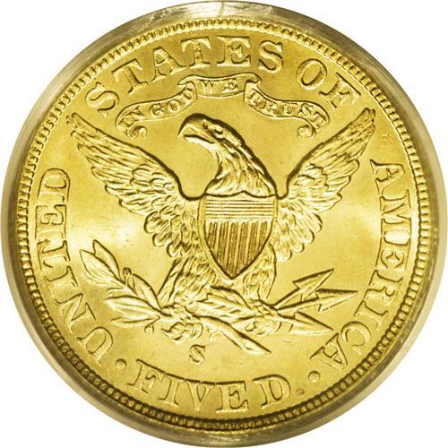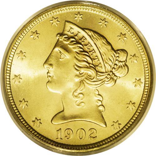 <B>1902-S<$5> MS66 PCGS.</B></I> A simply spectacular presentation, this luscious Premium Gem has everything going for it: The satiny luster is unbroken, front and back, with beautiful honey-gold color accented by glints of copper-gold and hazel on the reverse. Only minuscule evidence of contact can be seen under a loupe, and the strike is well executed, save for peripheral softness on the obverse stars. PCGS has graded 16 in MS66, with four coins finer (9/06).