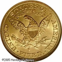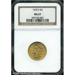 <B>1902-S $5 MS67 NGC.</B></I> The 1902-S is one of the more frequently encountered of the post-1900 Liberty Half Eagles. It is also one of the best produced issues in the series. This coin shows the bright, frosted mint luster that is so desirable on the '02-S Five, and it also displays even reddish-gold coloration that adds even more to the overall visual appeal of this coin. The creamy surfaces are virtually unaffected by even the smallest abrasions. One of the finest coins known from this popular issue. Population: 8 in 67, 1 finer (1/05). Lot:7902