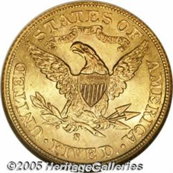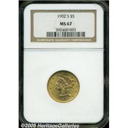 <B>1902-S $5 MS67 NGC.</B></I> The 1902-S is one of the more frequently encountered of the post-1900 Liberty Half Eagles. It is also one of the best produced issues in the series. This coin shows the bright, frosted mint luster that is so desirable on the '02-S Five, and it also displays even reddish-gold coloration that adds even more to the overall visual appeal of this coin. The creamy surfaces are virtually unaffected by even the smallest abrasions. One of the finest coins known from this popular issue. Population: 9 in 67, 1 finer (2/05).