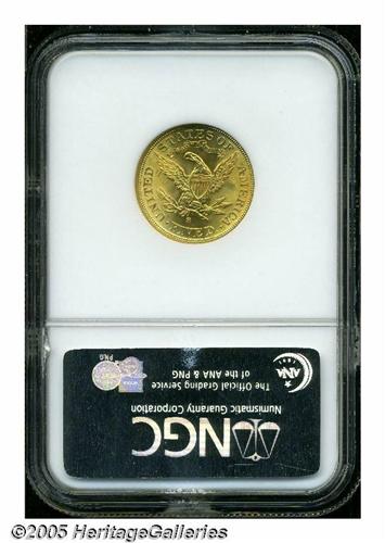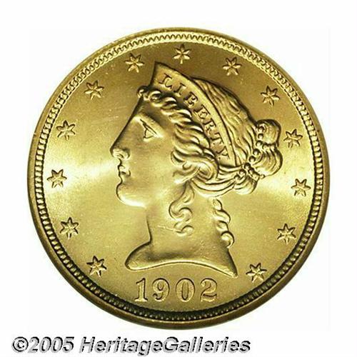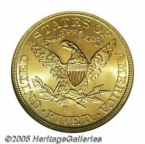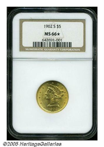 <B>1902-S<$5> <S MS66 NGC.</B></I> A superlative Gem. Brilliant and lustrous, with most design features showing bold and deep definition. Although the 1902-S is not a rare issue in Uncirculated grade, only a small portion of surviving examples could match the quality offered here. Here's a prize that admirably combines "flash" and beauty with condition rarity. Population: 27 in 66, 10 finer; with star: 1 in 66; 0 finer(5/05).