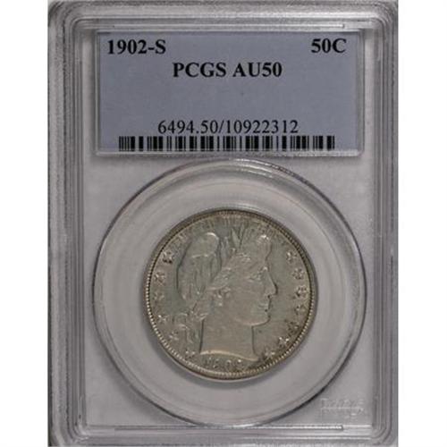 <B>1902-S 50C AU50 PCGS.</B></I> Soft, pleasing luster clings to the margins of this lightly circulated silver-gray piece. Well struck overall with few overt marks, though the portrait shows a few wispy abrasions and minor ticks. Population: 5 in 50, 48 finer (3/08).<BR><BR><B>Coin Engraver:</B> Charles E. Barber<BR><BR><b>Shipping:</b> Coins & Currency (<a target="_blank" href="http://www.heritageauctions.com/common/shipping.php">view shipping information</a>)