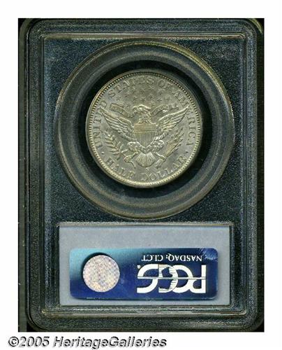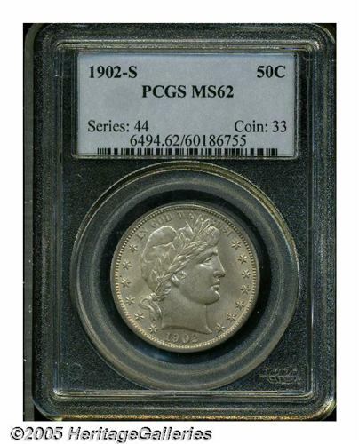<B>1902-S<50C> MS62 PCGS.</B></I> Light milky-rose color even sits on the surfaces that display light, pleasing luster. A few wispy marks are seen on close inspection, none particularly distracting.