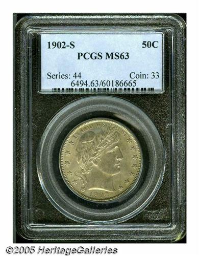 <B>1902-S<50C> MS63 PCGS.</B></I> Lovely olive and apricot surfaces, with pleasing matte luster. Some faint imperfections explain the grade, despite an excess of eye appeal.