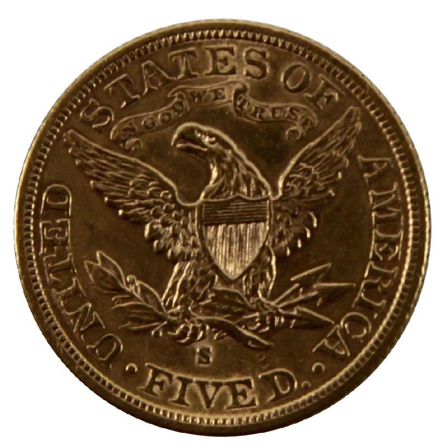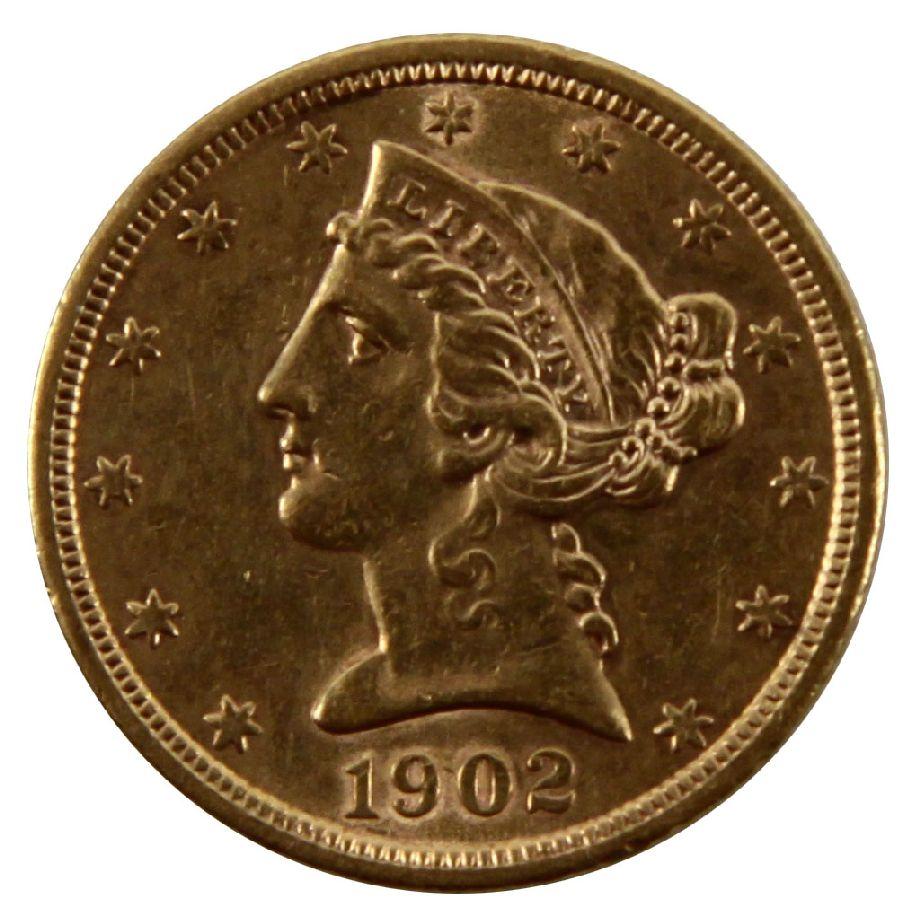 A gold $5 Half Eagle Liberty 1902s XF coin with Stack's auction ticket dated March 13, 14 1980 attached.