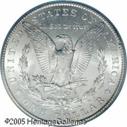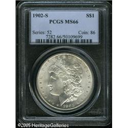 <B>1902-S<img border='0' src='http://www.heritagecoins.com/images/star.gif' width=10 height=10>$1 MS66 PCGS.</B></I> The 1902-S is a moderately scarce issue among late-date dollars. Only 1.53 million pieces were produced with Gems being especially elusive. In MS66 condition only 20 pieces have been certified by PCGS with a mere four coins finer (1/05). This is an especially attractive example that has shimmering mint luster that is unaffected by the abrasions that are usually seen on '02-S dollars. A bit softly struck in the centers, magnification shows only the slightest evidence of roller marks across Liberty's cheek. Brilliant except for just the slightest hint of color at the top of the obverse.<BR><I>From The Banks Collection.</B></I> Lot:10607