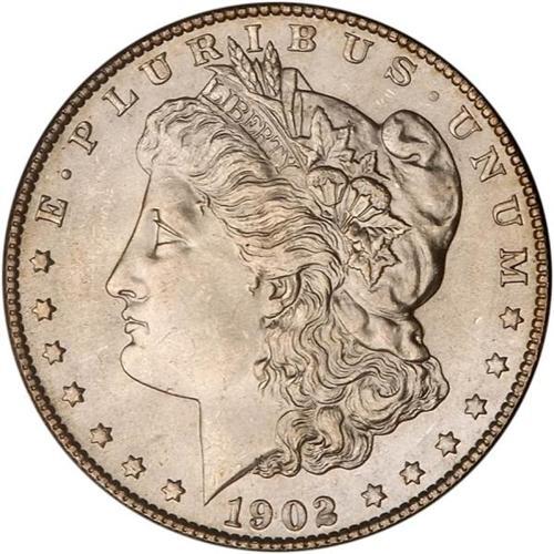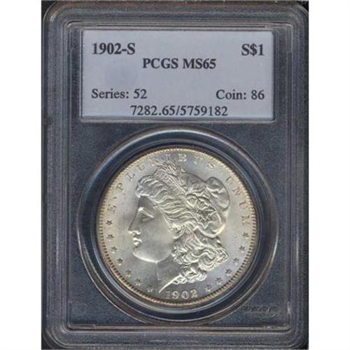 <b>1902-S Morgan Dollar. PCGS graded MS65.</b> Only faint, wispy die striation lines in the lower chin. Beautiful satin finish, sparkling as when first issued. Difficult to find S-mint silver dollar. Something perhaps worth pausing to study is the fact that all devices were struck with the usual and desirable consistency of this year, that is, sharply by the dies, which then left behind bold elements of detail throughout. The only point that a critic might fault is the hair above the ear; on the other hand, the eagle has excellent breast detail.